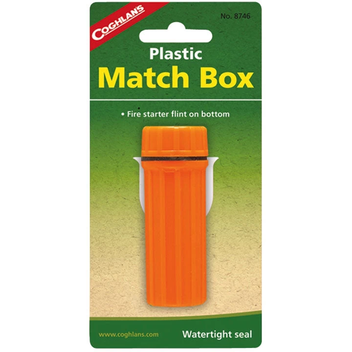 Plastic match box features a watertight seal and a fire starter flint on the bottom.
