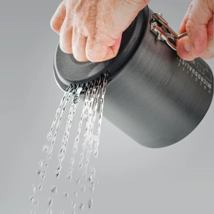 Welded stuff sack holds set while traveling and doubles as a sink or wash basin in camp