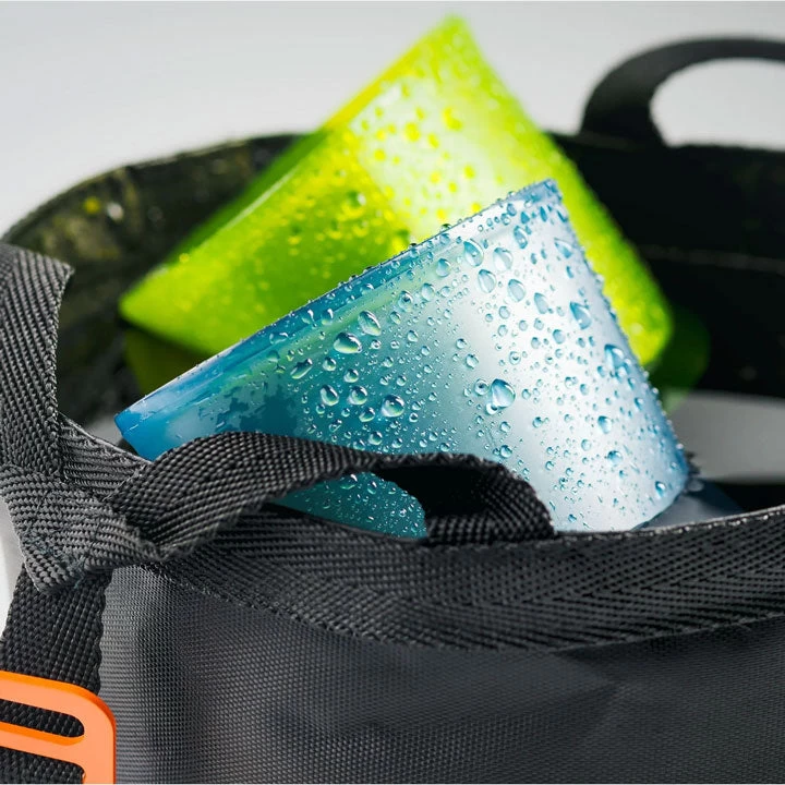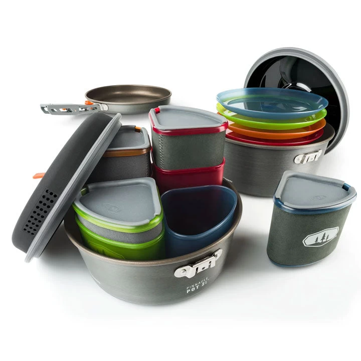 So efficient, so durable, so technically advanced, so colorful – this is the Pinnacle of campsite cooking. And eating, too. Garnet hard, the anodized aluminum pots and frypan are scratch proof and deliver efficient, even heating. Then we add Teflon® with Radiance Technology for amazing non-stick performance, easy cleaning, and amazing heat transfer that reaches temperature 25% faster than other coatings. When it’s time to eat, you’ve got four 14oz mugs with insulated sleeves and sip through lids, four 14oz bowls, and four plates – all color coded so there’s no mix ups. There’s also a pot gripper and our strainer lid for easy draining. And – of course – it all nests together perfectly into the storage bag that doubles as a camp sink.
