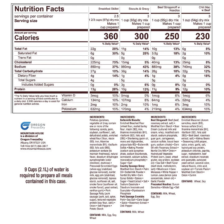 Enjoy one pouch each of the below classic recipes in the Mountain House Classic Kit: