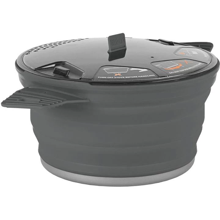 Until now, your camp cooking pot was the most bulky, awkward item in your kit. The Sea to Summit X-Pots change all that. The X-Pot is a fully featured cooking pot that combines the heat-distribution of aluminum with the flexibility of silicone. The hard anodized aluminum base offers a fast boil time and the stainless steel ring embedded in the rim lends a rigidity to the silicone walls for easy lifting and stirring. Top it off with a clear locking lid with an integrated strainer and you have a full-size pot that packs down to an inch tall disk. The added beauty of the X-Pots: Your X-Bowls and X-Mugs can nest inside for an exceptionally compact cook set. The X-Pot is available in 1.4L, 2.8L and 4L sizes.